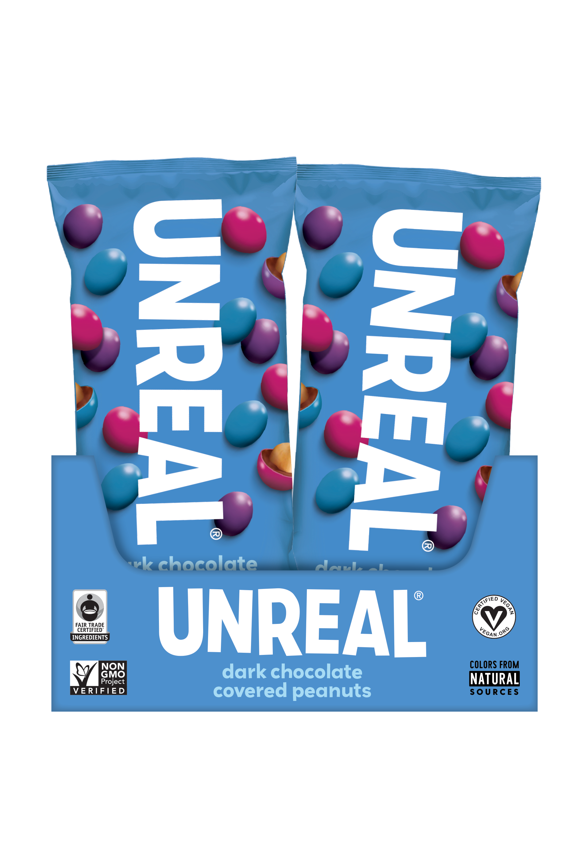 Dark Chocolate Peanut Gems SRP $2.29 for each 1.5oz bag * UNREAL is on a mission to build a world where you don't have to be afraid of your food, starting with your favorite indulgent snacks. * ALL-NATURAL: our dark chocolate covered peanuts are non-gmo project verified, do not contain soy ingredients and are made in small batches with fair trade certified ingredients. * COLORED BY NATURE: we only use colors from all-natural veggies such as spirulina and beets, and we never use titanium dioxide as a processing agent, as many similar products do. * VEGAN: our dark chocolate covered peanuts are certified vegan.