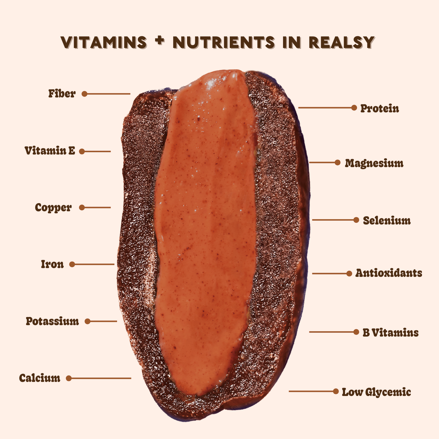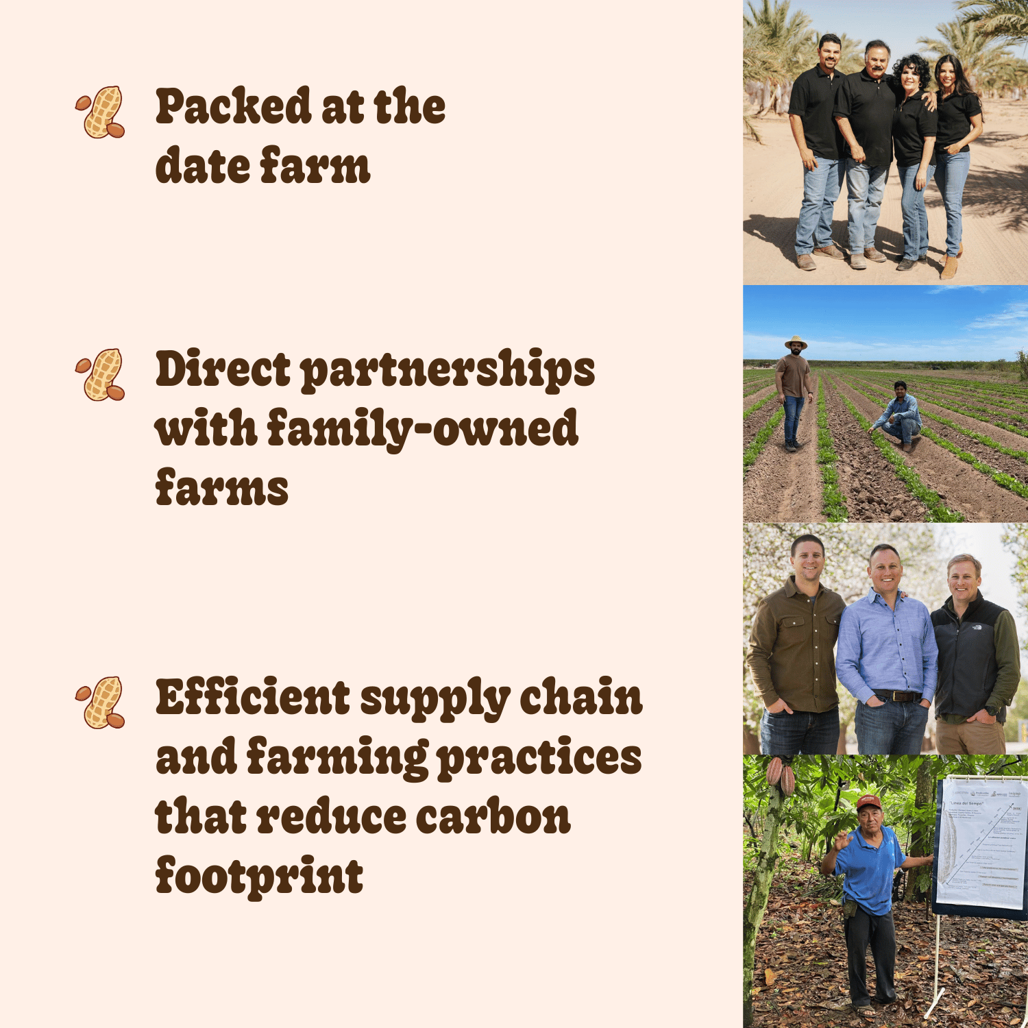 On-the-go snack: EMedjool dates stuffed with strawberry peanut butter. Pitted, mess-free, and naturally sweet, these PB&J dates are an easy grab-and-go snack for checkout coolers, café counters, snack walls, and travel sections. Bonus points for tasting like a fresh PB&J sandwich. Real ingredients, real nutrition: Made with just three simple ingredients: organic Medjool dates, peanuts, organic strawberry powder, and sea salt. No oils, fillers, preservatives, or artificial ingredients — a short ingredient list that stands out on shelf and online. Farm to table: Our organic Medjool dates are grown, harvested, pitted, and stuffed directly on a sustainable, family-owned date farm, delivering farm-to-table freshness, traceability, and reliable quality that wholesale buyers value. Vegan & gluten-free: Naturally vegan, gluten-free, dairy-free, soy-free, non-GMO, and no added sugar. Dates provide fiber and minerals, pea