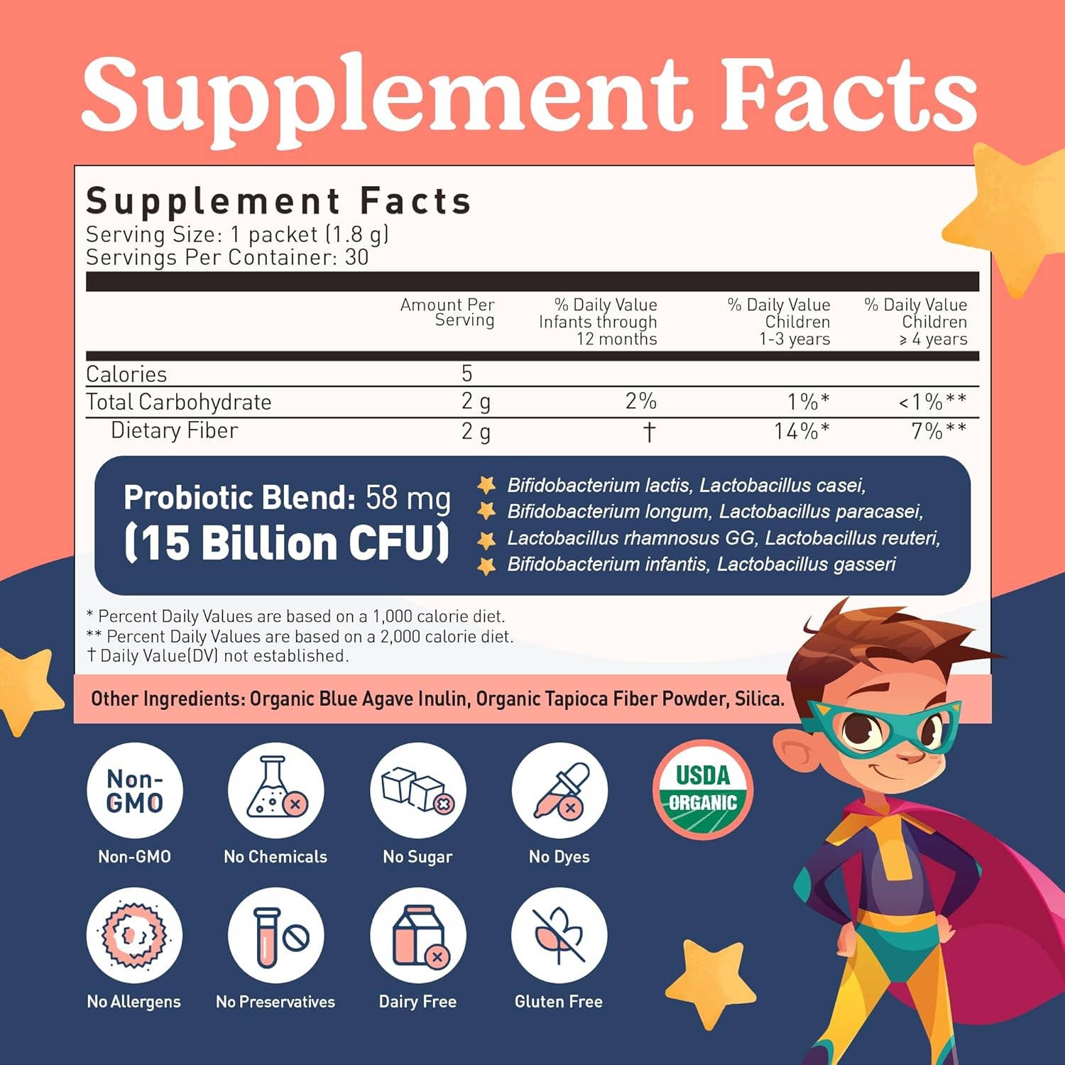 Help your kids feel their best from the inside out with our easy to mix daily pre-portioned stick packs! Our organic toddler probiotic was formulated with 8 powerful probiotic strains, all proven to help strengthen and improve your child’s developing digestive system and immune system. Plus, we’ve made sure to add prebiotic fiber to fuel the probiotic strains, so they can get to work on repairing your toddler’s gut health. And because we’re moms too, we’ve made sure that none of our products include GMO’s, allergens, artificial colors or flavors.